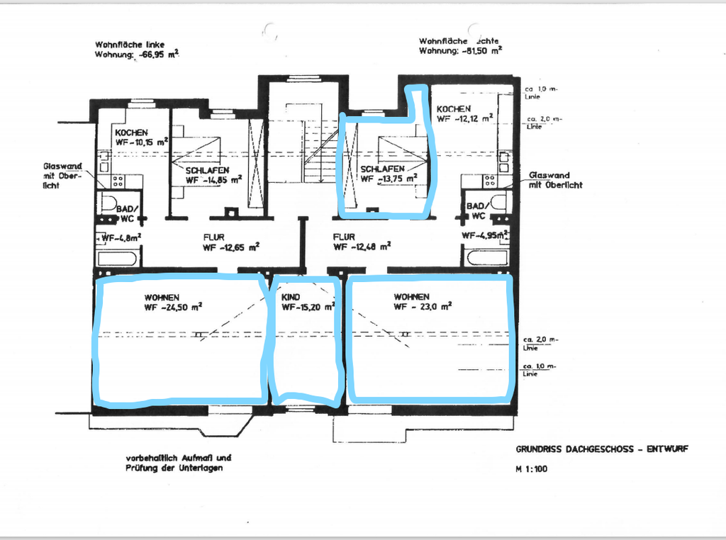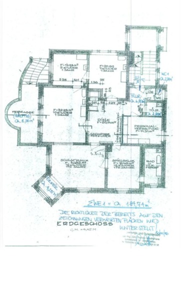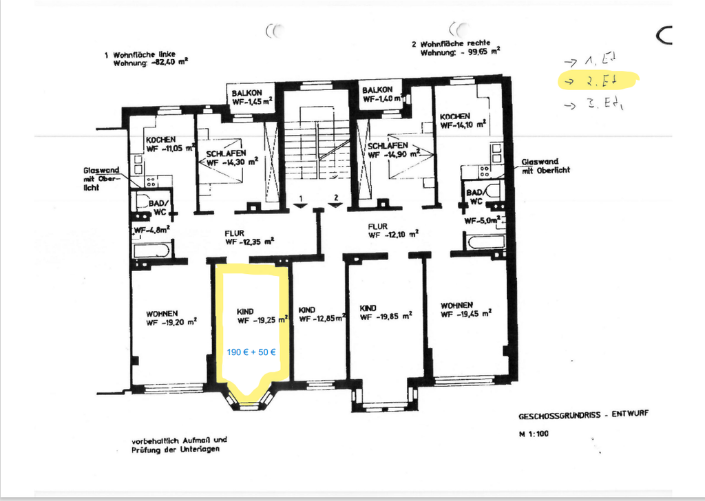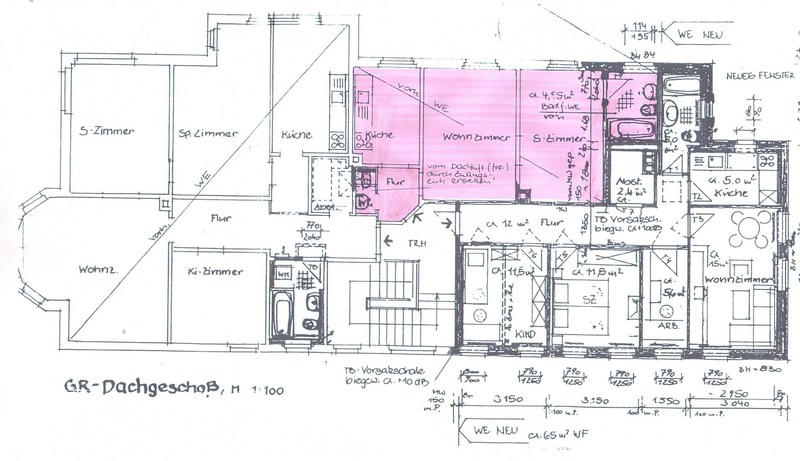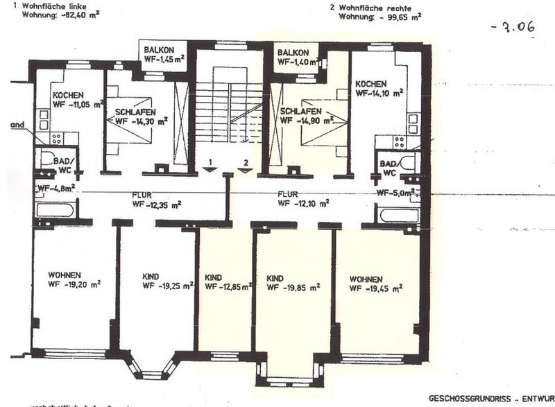 Die Wohnung kann mit 3 bis 6 Zimmern (dann 2 Bäder und 2 Eingänge) übergeben werden. Es ist ein großes Wohnzimmer mit ca. 35 qm geplant (im Plan bereits eingezeichnet).