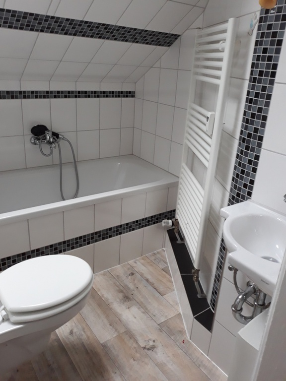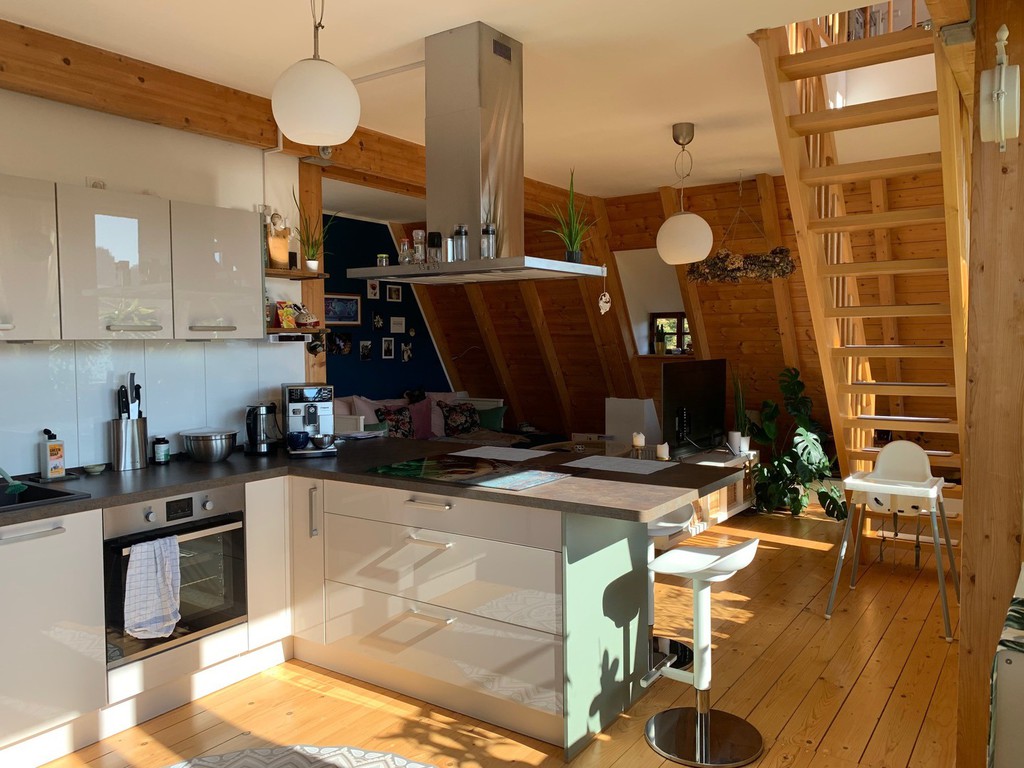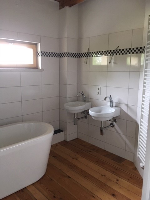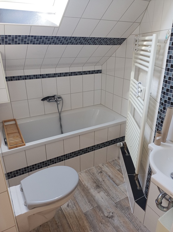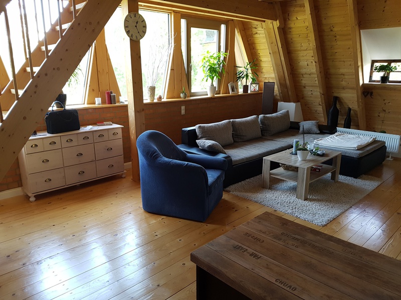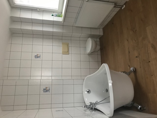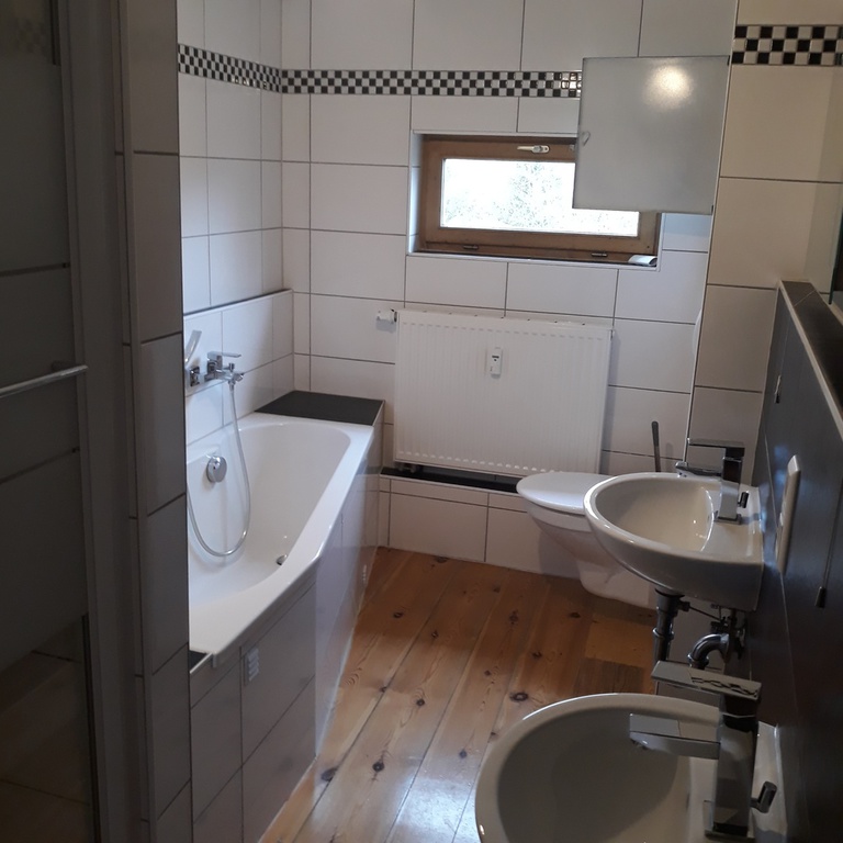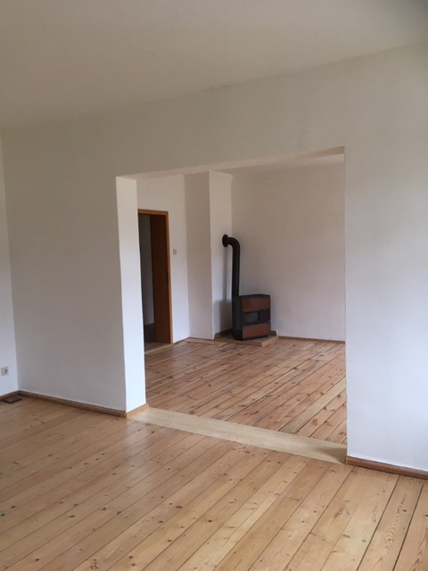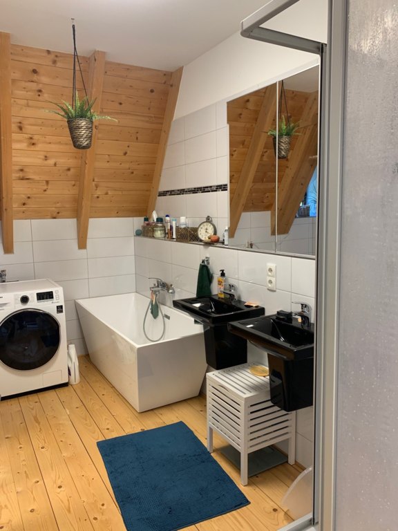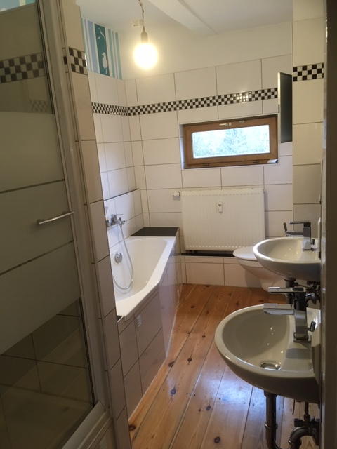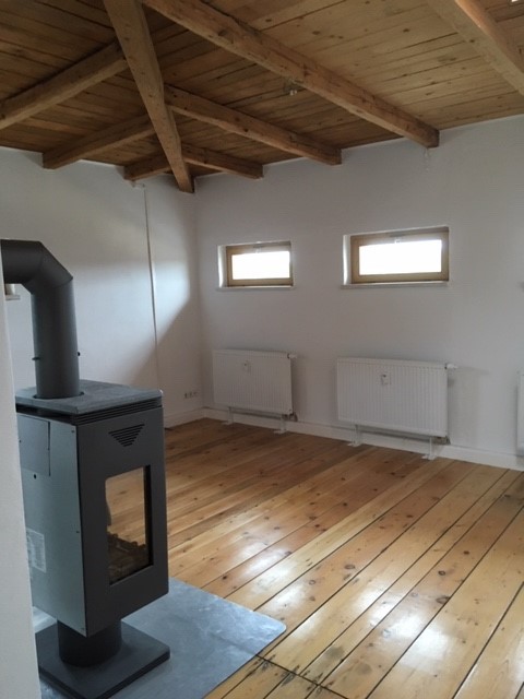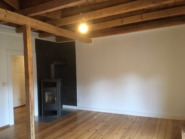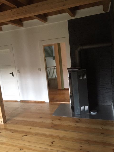 Wohnzimmer, Küche, 4 Schlafzimmern, eigenes Treppenhaus, 2 Bäder, separate Toilette, Kaminofen, freistehende Badewanne