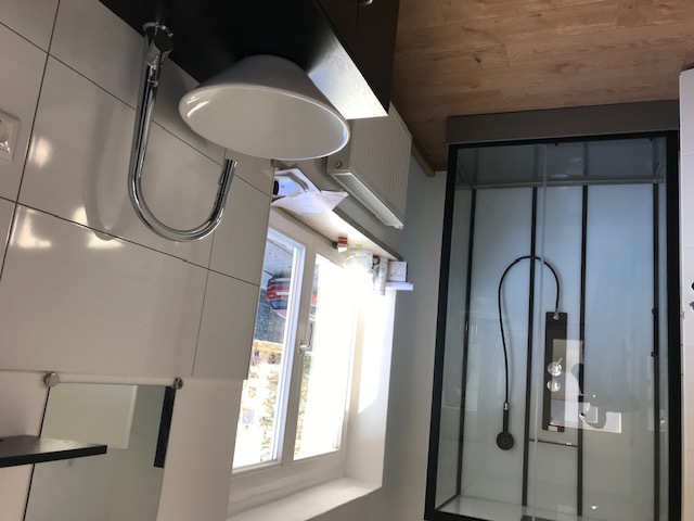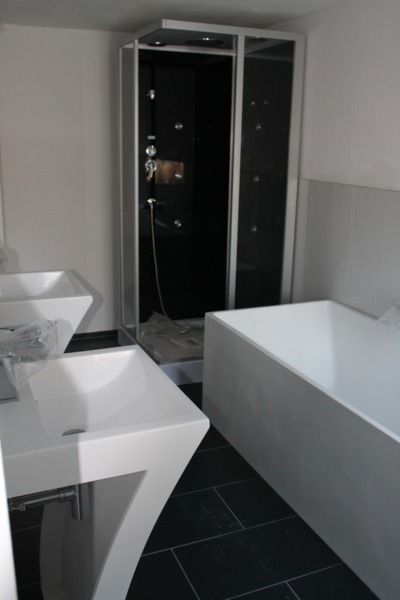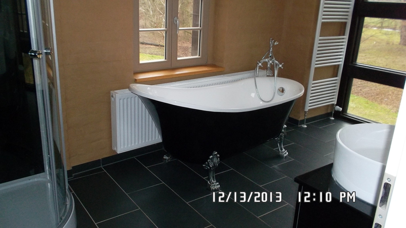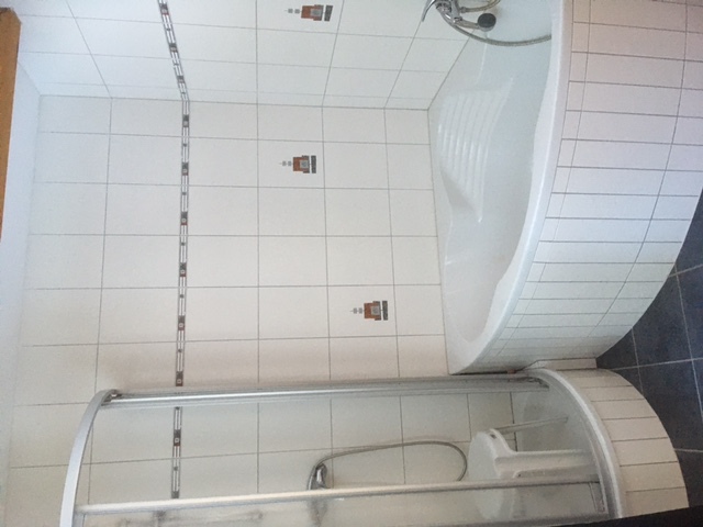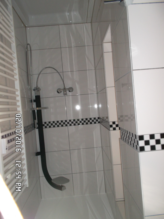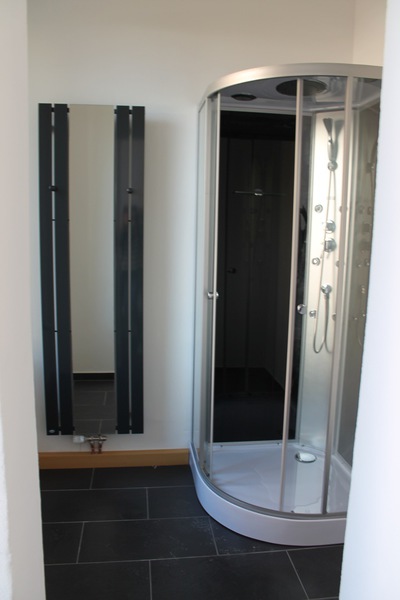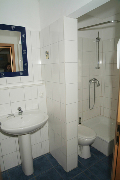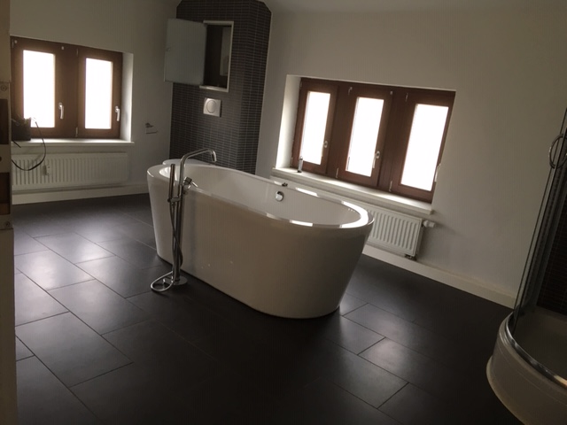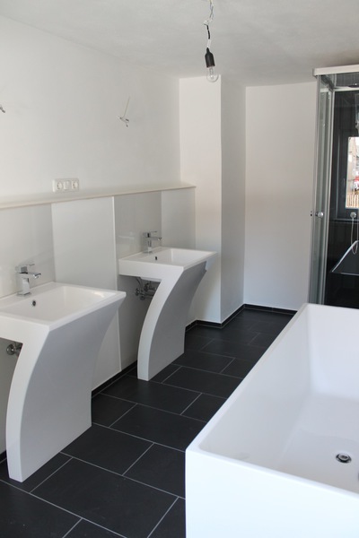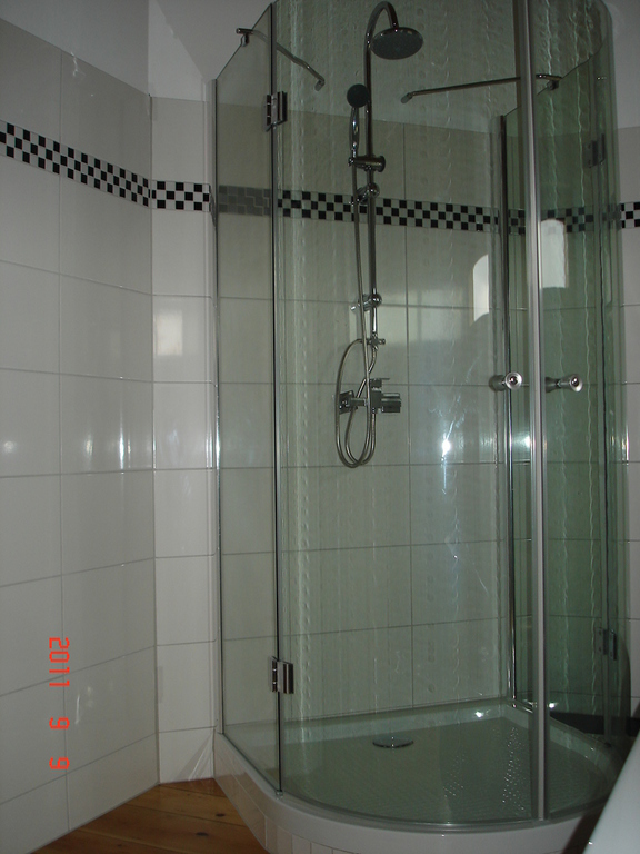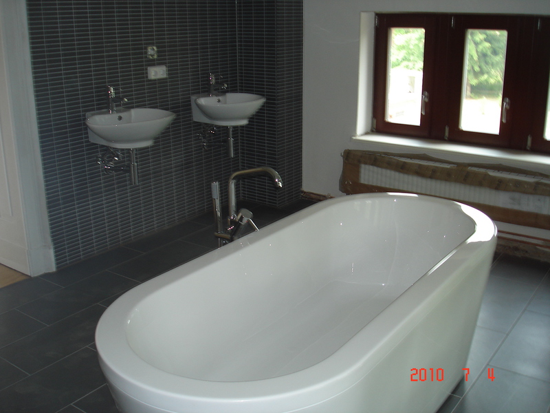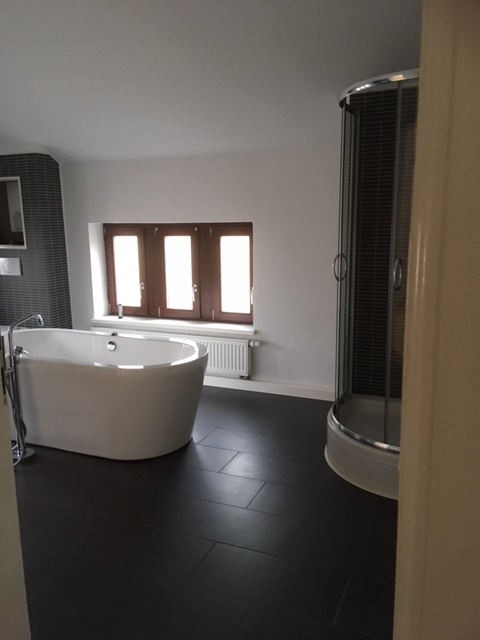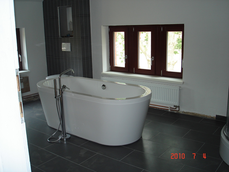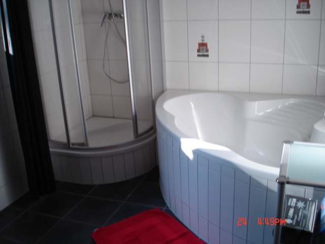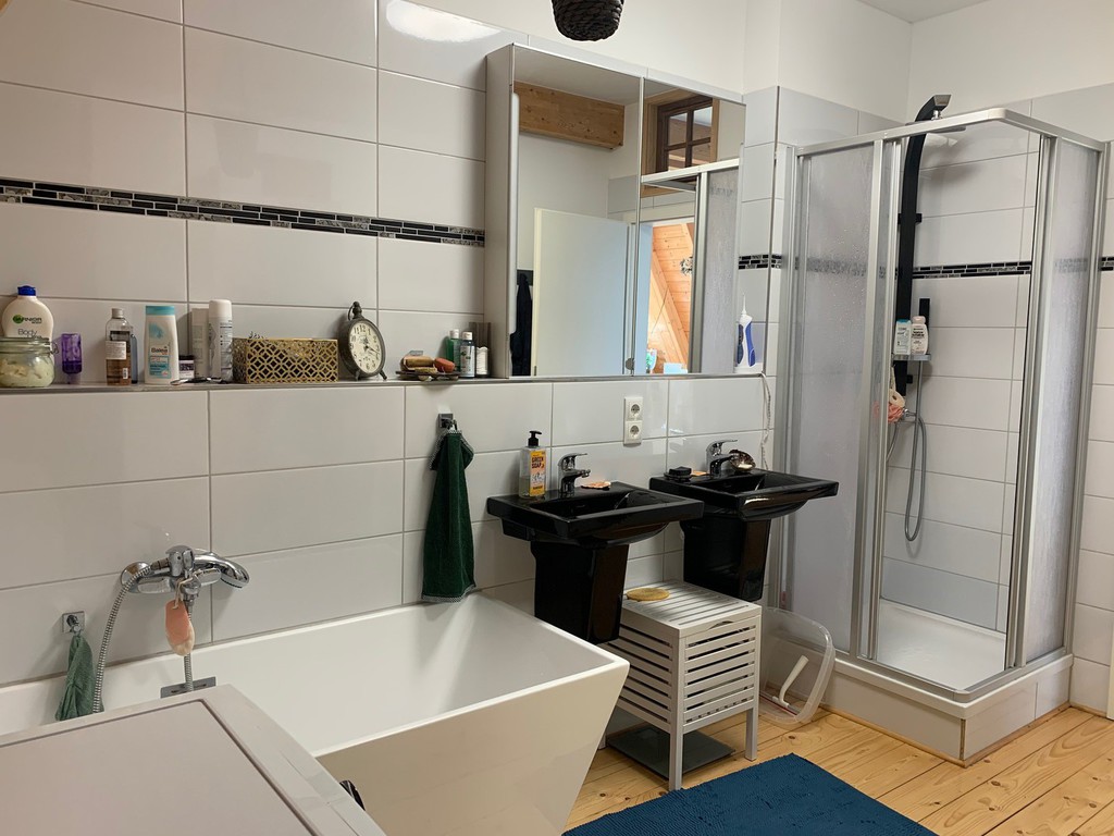 - Badezimmer mit Dusche und freistehender Badewanne und