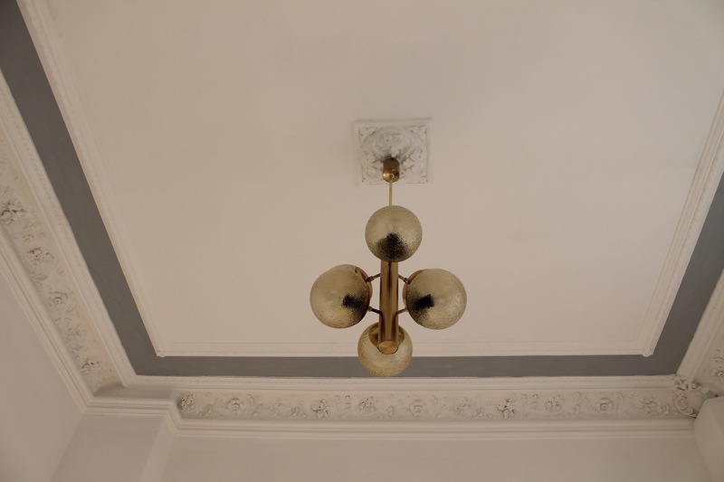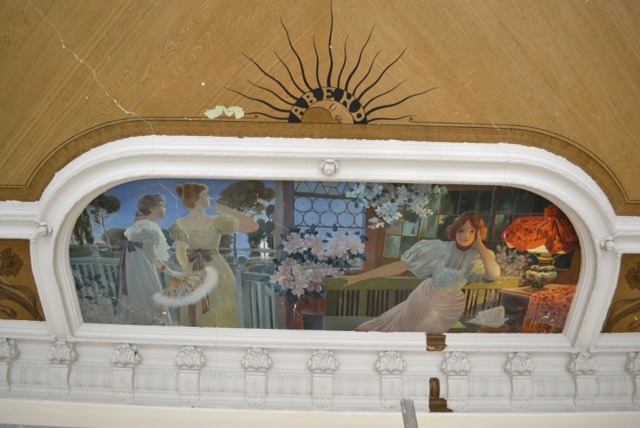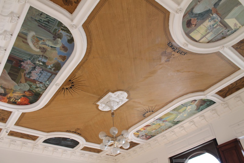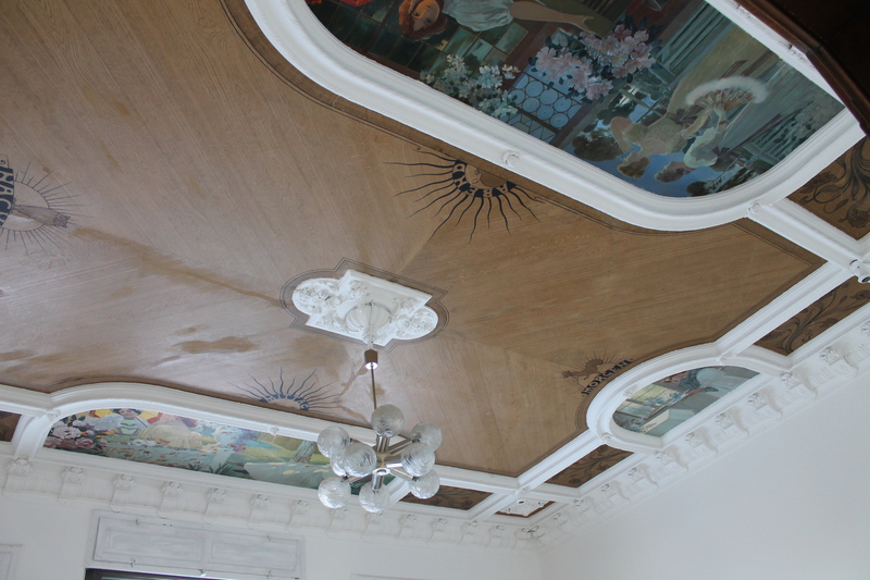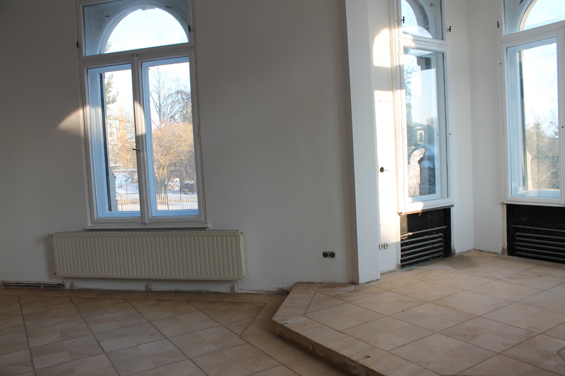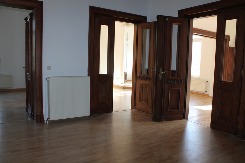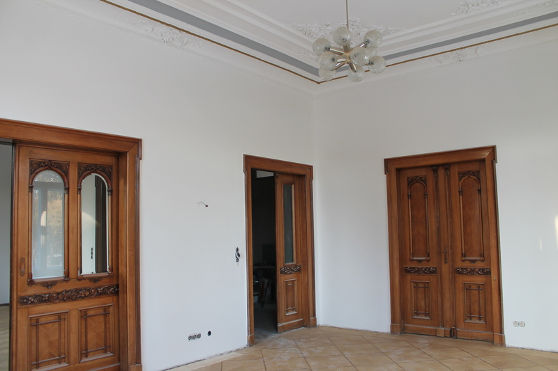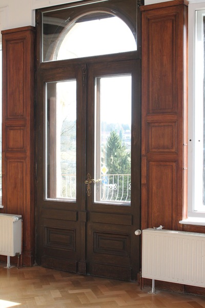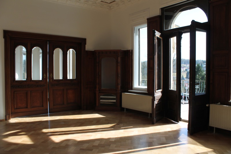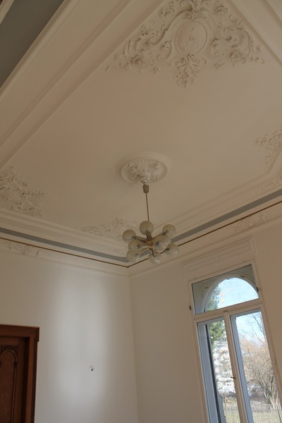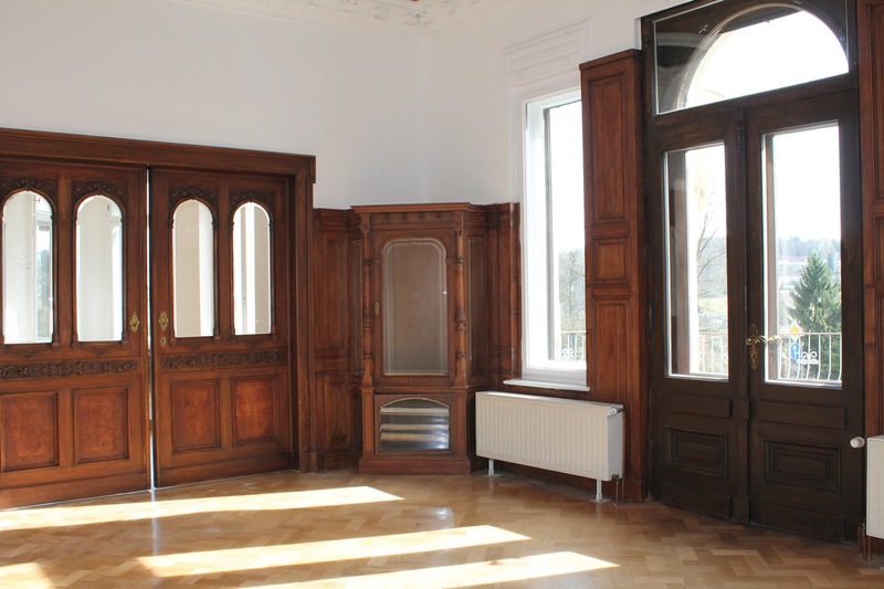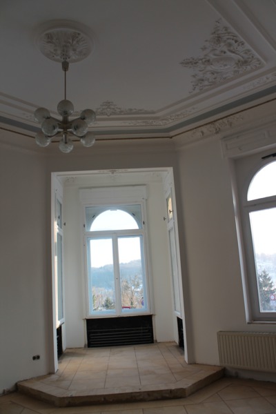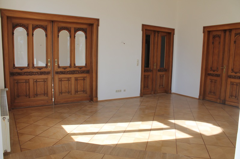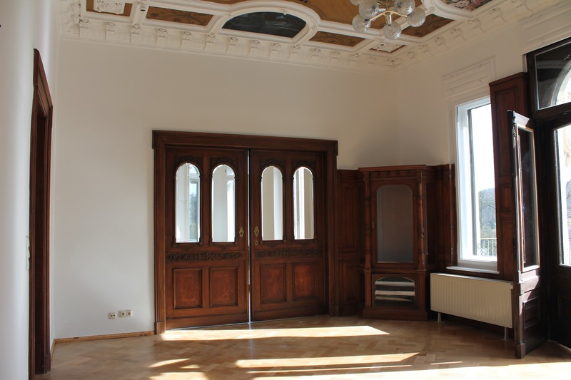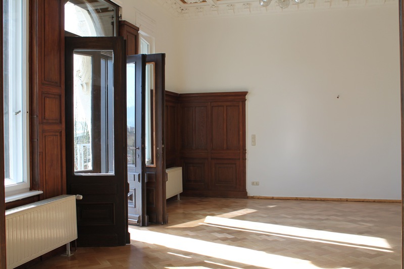 bemalte Decke, Stuckdecken, Wandverkleidungen, Bleiverglasungen, Parkett, große Originaltüren mit historischen Türbeschlägen, Kastenfenster mit Isoscheiben, Terrassen, Erker